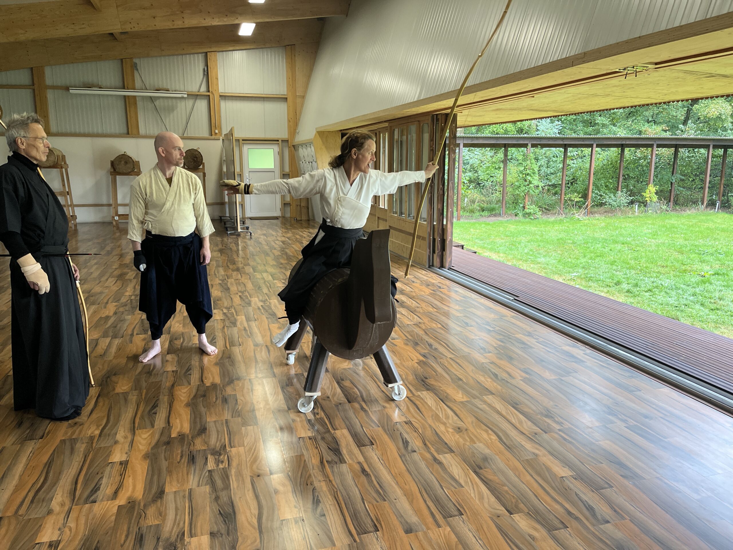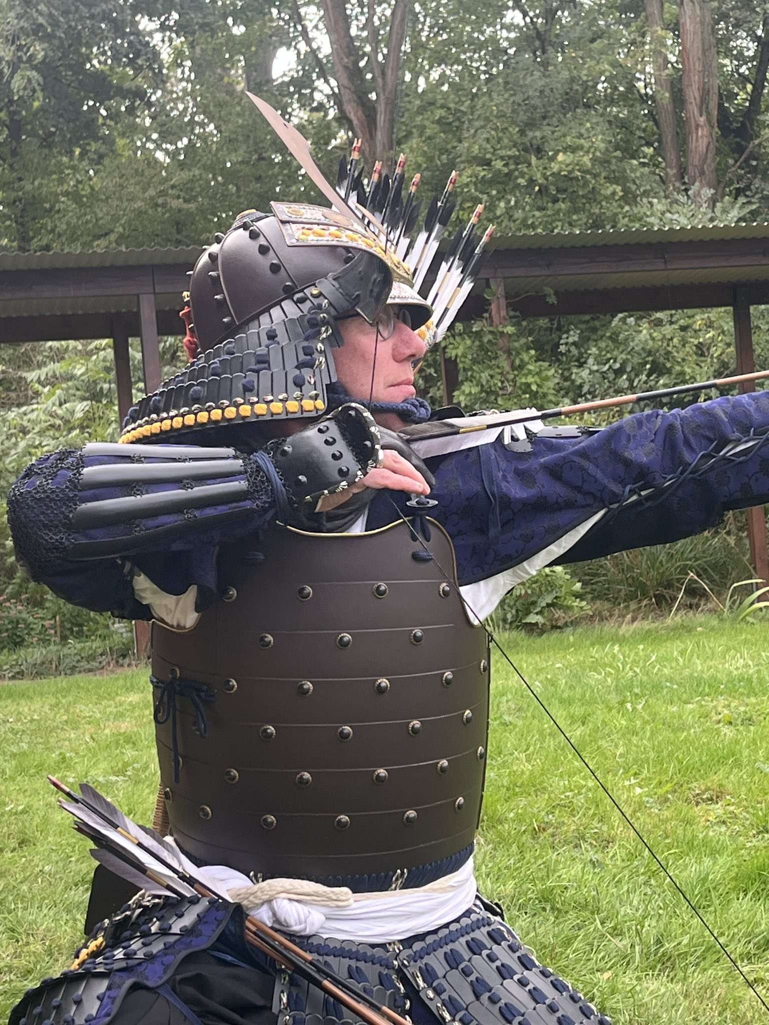 Zum anderen hatte Andreas den Kabuto (Helm) seiner Rüstung mitgebracht, und so konnte jeder mal versuchen, mit Helm zu schießen. Die Herausforderung ist zum Einen das Gewicht (der Helm ohne Menpo (Maske) wiegt ca. 2,5 kg), zum Anderen die stark eingeschränkte Bewegungsfreiheit und Sicht, und zum Dritten die seitlichen Flügel, die einen vollen Auszug unmöglich machen. Die rechte Hand zieht dabei bis zur rechten Schulter, die linke muss entsprechend tiefer zielen.